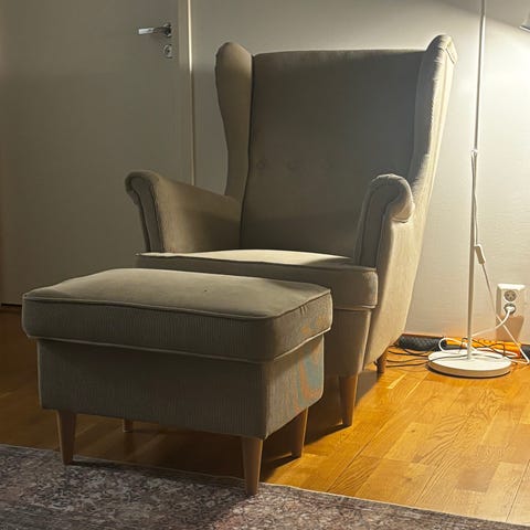 Myydään pois ikean strandmon nojatuoli+ rahi (koska ei sovi meidän muuhun sisustukseen) Pesty juuri tekstiilipesurilla. Ehkä pientä kulumaa havaittavavissa käsinojissa, mutta todella siistissä kunnossa muutoin.