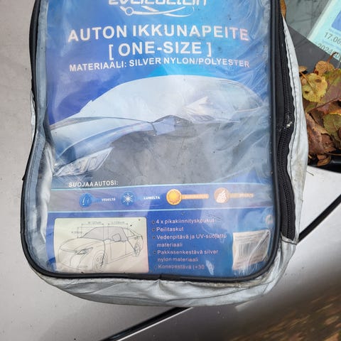 Useimpiin autoihin sopiva suojapeite ja moottorilämmittimen johto.