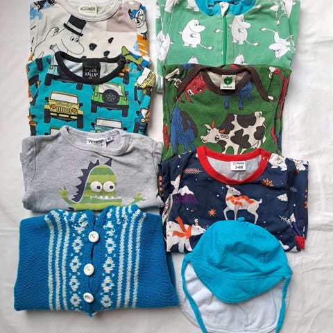 Iso vaatepaketti pojalle/unisex. Enemmän käytettyjä vaatteita, eli suurimmassa osassa jotain haaleaa tahraa tai haalistumaa tms. Kunto näkyy lähikuvista. Koko 62 ja 68. Kaksi bodya koossa 80.