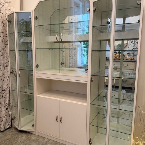 Myydään vanha, iso vitriini/kaappi, jossa on koko kaapin levyinen säilytystila: vasemmalla umpiovi, keskellä lasiovet ja oikealla laatikosto. Paljon säilytystilaa.