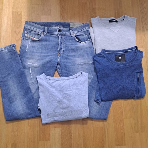 Miesten M koon vaatepaketti, ei priimaa mutta ok siistissä kunnossa kaikki. Neljä H&M kauluspaitaa, Adidaksen housut, Tommy Hilfigerin paita, Leviksen paita, Peakin huppari vetoketjulla ja Champion huppari. Kaikki pakettina 30€! Nouto Luvialta tai Porin keskustasta arkisin.