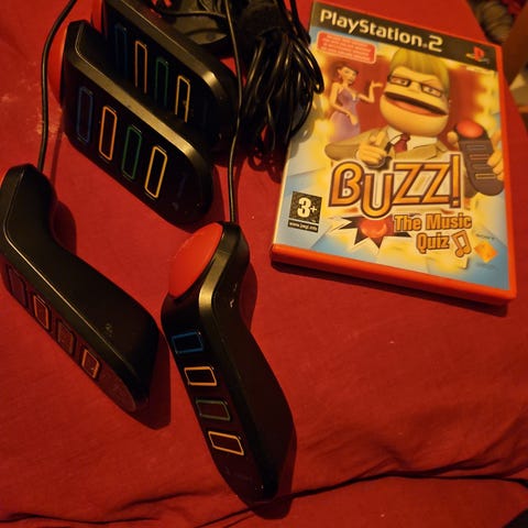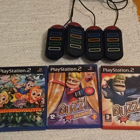 Buzz ohjaimet ja kolme peliä. Todella hyvä kunto.