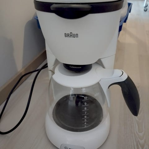 Braun kahvinkeitin valkoisella värillä. Laite on suunniteltu kotitalouskäyttöön kahvin valmistamiseen. Mukana käyttöohje. Vähän käytetty. Puhdistettu. Vain nouto.
