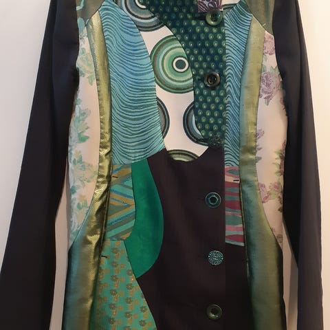 Kaunis siniharmaa takki, viileisiin ilmoihin mutta ei pakkasille. Kokomerkintä 38, tyypillisen nafti, pikemminkin 36. Alin nappi puuttuu, tätä ei käytössä huomaa.