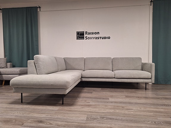 Myynnissä Belluksen valmista Trendline avokulmasohva. Belluksen sohvat tunnetaan erittäin vahvoista puu / vaneri rungoistaan. Sohvan runko on paksua puuta / vaneria. Ei siis murenevaa lastu / huonekalulevyä. Kankaan väri harmaa. Erittäin kirkkaassa valossa aavistuksen rusehtavan harmaaseen taittava. Sohvan istuin ja selkätyynyjen päälliset ovat irrotettavissa pesuun. Sohvassa avokulman puolisuus kuvien mukainen. Ei vaihdettavissa. Sohvassa ei ole vuodeominaisuutta. Trendline sohvat myydään normaalisti noin 20cm korkeilla jaloilla. Tähän sohvaan on tehtaalta lähtiessään valittu 11cm korkeat jalat. Tästä johtuen sohvan istuinkorkeus on melko matala. Tämä on hyvä valinta lyhyelle istujalle ja lapsiperheille. Yli 175cm pitkälle asiakkaalle reisituki saattaa olla riittämätön. Sohvaan vaihdetaan meidän toimesta 20cm korkeat mustat kalustejalat aivan lähipäivinä jos ei mene näillä jaloilla nopeasti kaupaksi. Tämän jälkeen hinta nousee luonnollisesti hieman. Huomioitavaa sohvan kunnossa: Osa selkätyynyistä aavistuksen menettäneet ryhdikkyyttään. Tämä huomioitu hinnassa. Sohvan hinta: 659e.