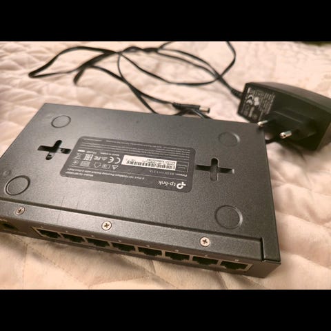 TP-Link sovitin, valkoinen, verkkosovitin, varustettu kahdella antennilla ja Ethernet-portilla. Käytetään langattoman verkon laajentamiseen.