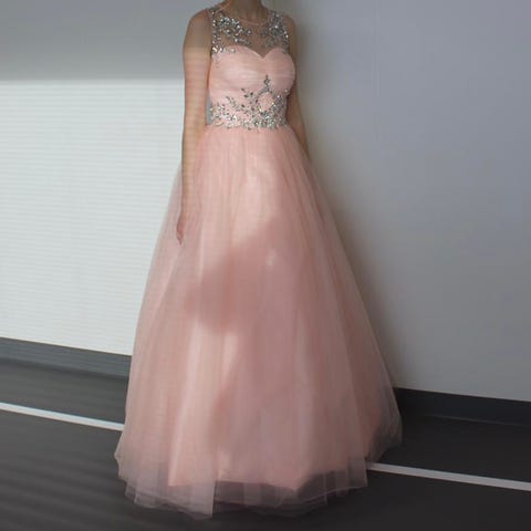 Muutama vuosi sitten ostettu käytettynä. Väri vaalean sininen/harmaa, hieman jopa liilaan taittava. Mekkoa on hieman pienennetty vyötäröstä. Tarkka koko ei ole tiedossa, mutta itselle sopiva (olen 170 cm ja vaatteet yleensä kokoa S-M). Saa tulla sovittamaan! :)