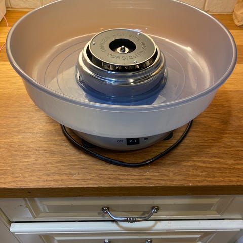 Rent a fun cotton candy machine with a cart for children's (and why not adults') parties and events. It comes with a wheeled cart that allows easy transportation and a comfortable working position anywhere. The machine has a plastic protective cover, which makes it easier to make cotton candy outdoors.