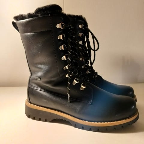 Pomarin lämpimät, vuorelliset, ja vedenpitävät - Gore-Tex -käsitellyt - nahkaiset talvisaappaat, joissa on myös hyvä pito. Näillä selviää hyvin Suomen talvessa räntäsateessa ja pakkasella, niin kaupungissa kuin toimistolla. Saappaita on käytetty kerran.