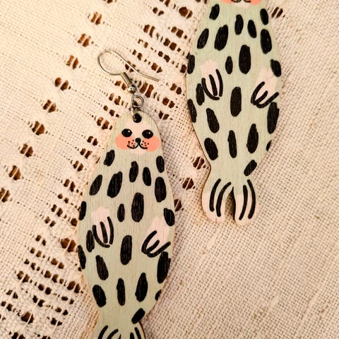 Isot puiset apina-aiheiset korvakorut. Kuvio molemmilla puolilla. Korun halkaisija n. 7 cm.