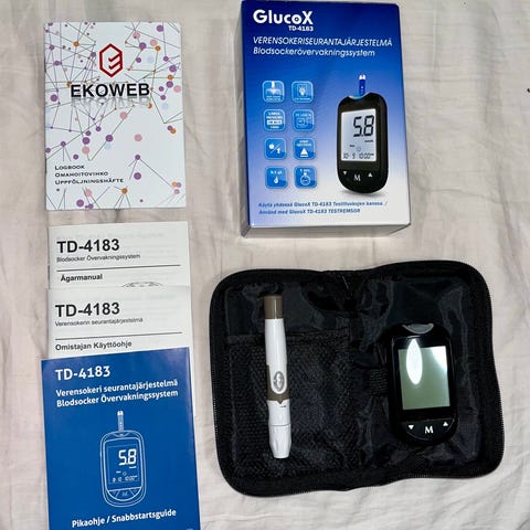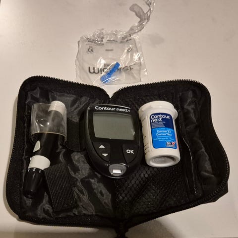 Uusi Contour Next verensokerimittari. Pistolaite ja lansetit avaamattomina muovipusseissaan.