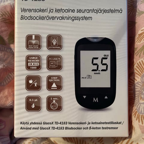 Erittäin hyväkuntoinen GlucoX verensokerimittari, pistokynä, käyttöohje ja omahoitovihko mittaustulosten kirjaamista varten. Lansetit ja liuskat hankittava erikseen.
