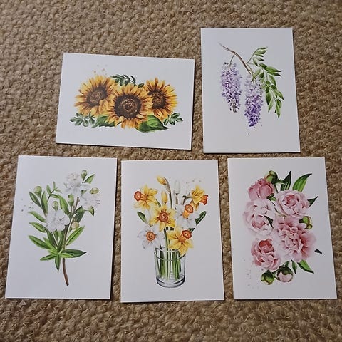 Erilaisia kortteja, joissa on kukka-aiheisia kuvituksia. Kortit ovat eri kokoisia ja sisältävät erilaisia kuvia, kuten kukkia ja kasveja. Sopivat esimerkiksi onnittelu- tai tervehdyskorteiksi.