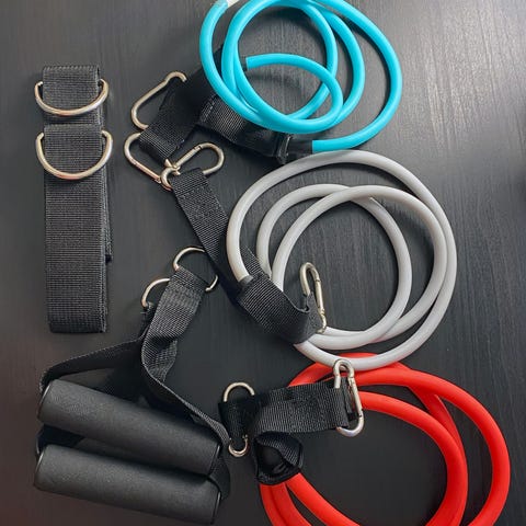 Sisältää 5 erivahvuista nauhaa (10–50 lbs / 4.5–22.6 kg), kahvat, oven ankkurin, nilkkahihnat, säilytyspussin ja ohjeet.