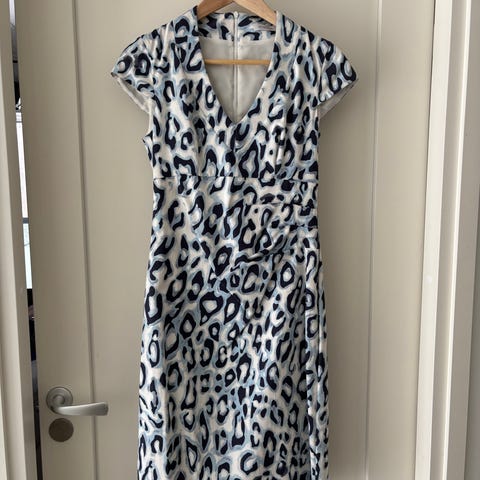 Laskeutuvaa viskoosia, kauniit pitsiyksityiskohdat. Solmimisnauha taakse. 34, mutta menee koolle S ja henkilölle, jolla B 75 liivit. Mekon helmat levenevät alaspäin, joten menee lanteikkaammallekin vartalolle. Uusi, mutta laput poistettu.