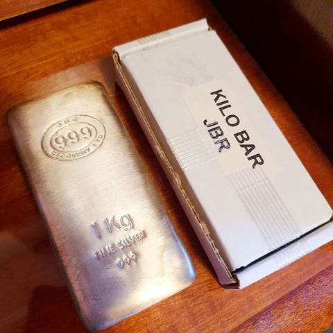Valcambi 1 kg hopeaharkko, valmistettu puhtaasta hopeasta (999,0). Harkossa on leima ja sarjanumero tunnistettavuutta varten.