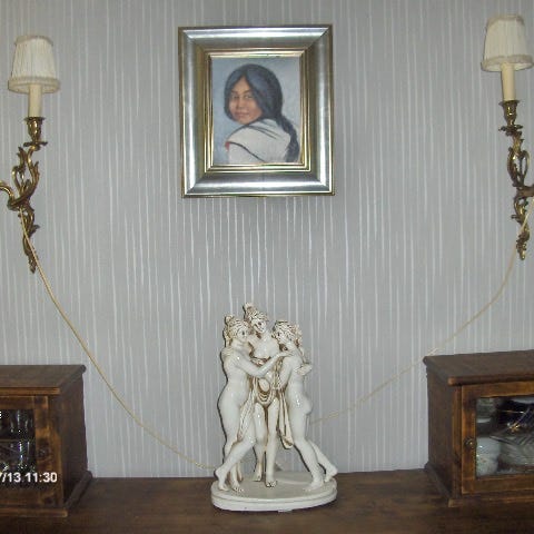 Kaksiosaiset seinäkruunut, joissa on koristeelliset lehväkuviot ja kaksi kynttilänpidikettä. Valmistettu messingistä, joka antaa niille kultaisen hohteen ja arvokkaan ulkonäön. Sopivat hyvin seinälle kiinnitettäväksi ja tuovat tilaan vanhan ajan tunnelmaa.