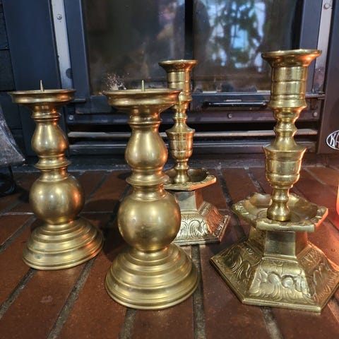 Kruunuissa on havaittavissa kulumaa ja patinaa, mikä on tyypillistä vanhemmille messinkiesineille. Pieniä naarmuja ja värimuutoksia, mutta yleisilme on edelleen näyttävä ja koristeellinen.