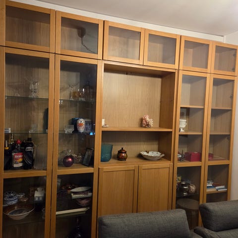 Hakusanat: lasikaappi, huonekalu, huonekalut, hyllyköt, säilytyskaappi, valkoinen kaappi, käytetyt huonekalut, lukittava kaappi, hyllykkö, säilytys, hylly, hyllyt, taso, tasot, vitriinikaappi
