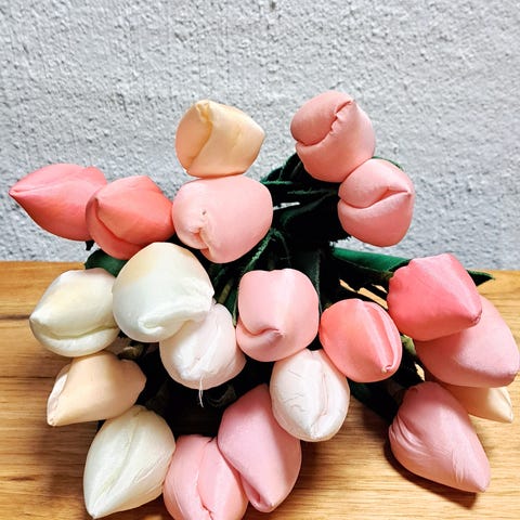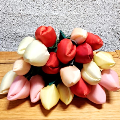 20 kpl kimppu Kangastulppaanien pituus 30cm. Kimpussa viininpunaisia ja valkoisia tulppaaneja. Valkoisissa tulppaaneissa pieniä kellastumia. Yhteensä 6€