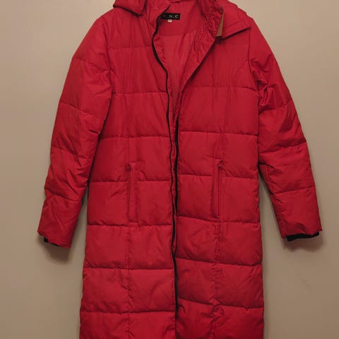 Lämmin, sininen toppatakki. Irroitettava huppu. Edessä kaksisuuntainen vetoketju ja vetoketjutaskut molemmilla sivuilla. Suora, reilu malli. Hupussa kiristysnauhat ja kauluksessa 2 nepparia.