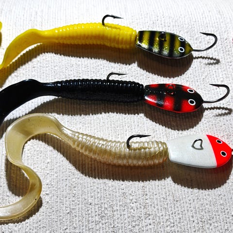 Kuusi hienoa käsintehtyä, vähän harvinaisempaa syvän veden vaakapilkkiä varustettuna "kuhapallukka" -värikoukuilla (65e + kulut).