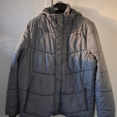Punainen, hupullinen ja siisti toppatakki, koko XL.