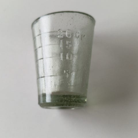 Vanhanajan mittalasi. Pohjassa minimaalisen pieniä siirronjälki, mutten hyväkuntoinen, siisti ja ehjä histoorilaista kotimaisista esinettä.