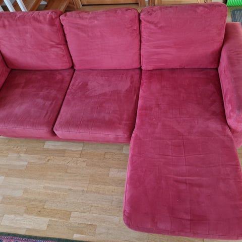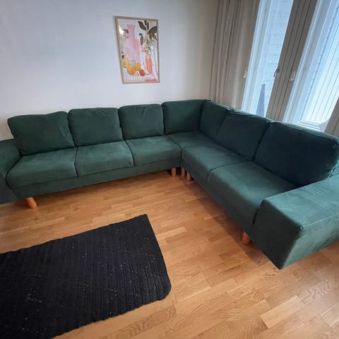 Kuvan mukainen samettinen sininen divaanikulmasohva. Päälliset irrotettavat. Ollut käytössä 3vuotta. Hyvässä kunnossa.