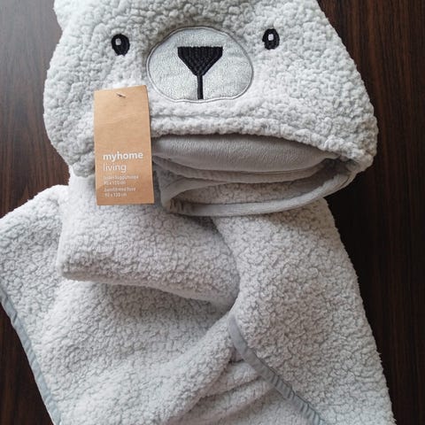 Lasten vaalea karhuhuppupyyhe, jossa on karhun kasvojen kuviointi hupussa. Unelma-design. Ollut harvalla käytöllä. Suorakaiteen mallinen, n. 66×118cm ilman huppua