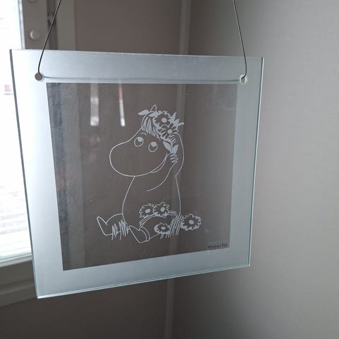 Myydään lasinen Muurlan lasinen Muumi nuotokuva. Taulun koko 22 cm x 22 cm. Pakkaus sisältää taulun sekä ripustinvaijerin.