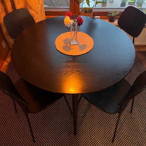Hyväkuntoinen ruokapöytä myyntiin uuden tieltä. Halkaisija 110cm.