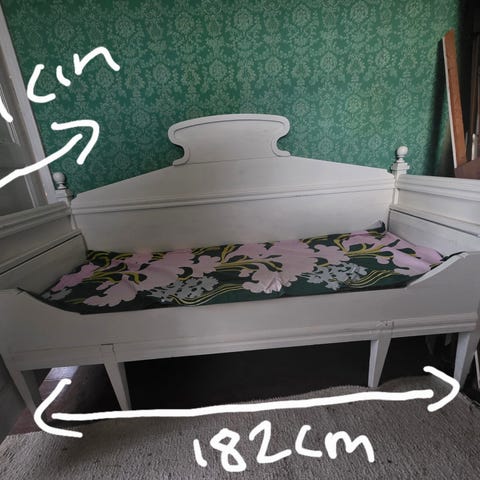 Vanha 1930 luvulta oleva avattava ”seslonki”. Pituus avattuna 215 sm, Tyyny käännettynä paikoilleen 190 sm. Puuosat hyväkuntoiset, kangas kulunut päältä rikki, vaatii verhoilun.