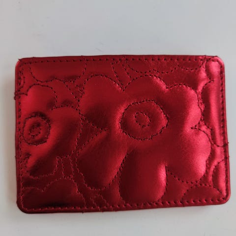 Marimekon uusi ja käyttämätön unikko korttikotelo. Materiaali nahkaa. Mukaan myös pieni säilytyspussi tuotteelle.