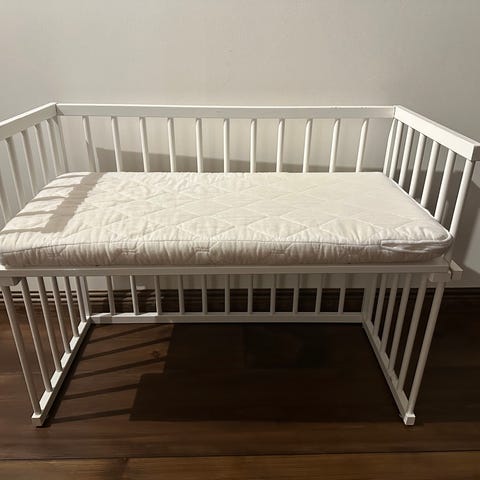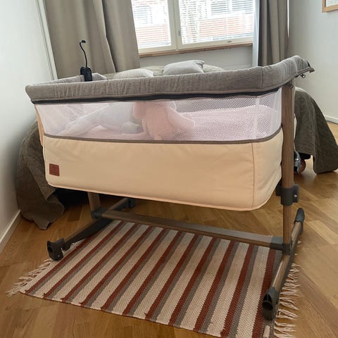 Siisti ja sievä vauvan sivusänky patjan kanssa ensikuukausille. Pohjan korkeutta voi säätää. Hyväkuntoinen, ollut käytössä kahdella vauvalla.