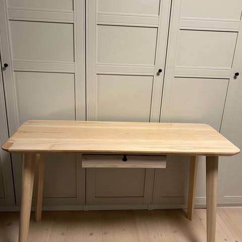 Myydään IKEA FJÄLLBO -pöytä. Metallirunko ja puupinta. Oikealla puolella pyörät, joten pöytää on helppo liikutella.