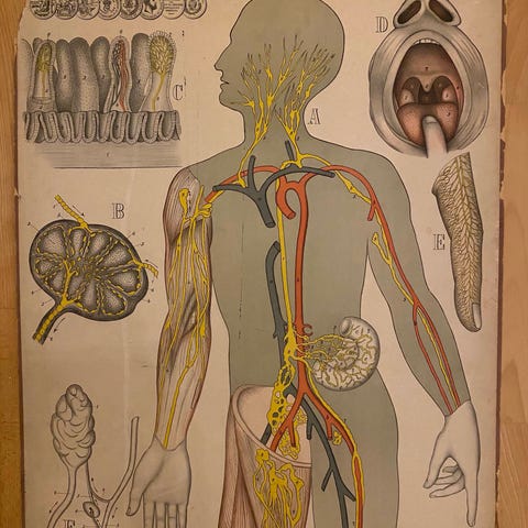 Wanha opetustaulu aivoista ja munuaisista. Kuvan mukainen kunto. Koko 65 x 91 cm. Tämä on sen kokoinen, että kannattaa hakea