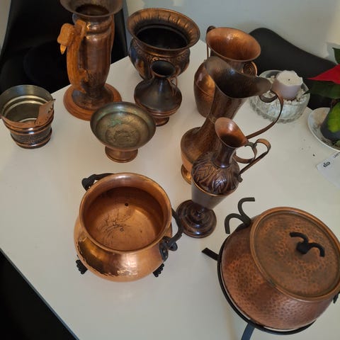 Ison maalaistalon köökkiin aikojen saatossa kertyneitä ikivanhoja kupariastioita yhteensä 7 kpl: isoja, pieniä, korkeita ja matalia. Kaikki kauniisti patinoituneessa alkuperäiskunnossa, puhtaita, ehjiä ja passelisti käytössä lommoja kylkiinsä saaneita. Kuparinkiiltoista arvorustiikkia mökille tai keittiöön! Mittatikkuna isoin kattila: sen korkeus 28 cm, halkaisija 33 cm. Myydään vain kaikki yhdessä eli seitsemän kaunista, vahvaa ja ehjää kupariastiaa yhteensä 180 euroa. Kotiinkuljetus järjestyy samaan hintaan Tampereella ja naapurikunnissa, lähetyskulut lisätään. Kysy!