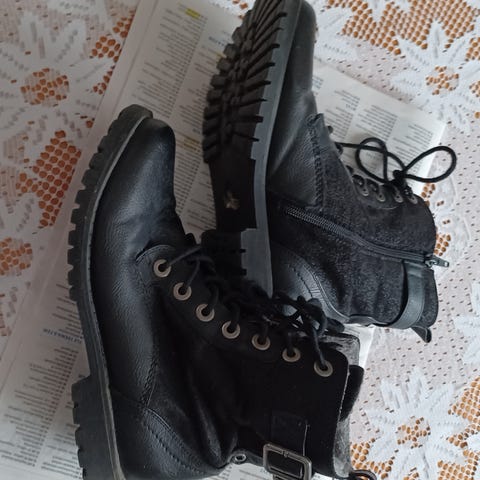 Naisten vähän käytetyt mustat nilkkurit. Koko 38. Edessä nauhat ja kengän suussa neuloskoriste ja sivussa koristevetoketju.