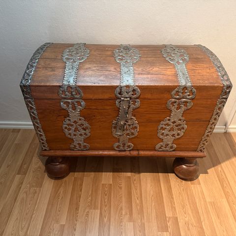 Myynnissä näyttävä ja painava puuarkku, jossa upeat käsin veistetyt koristepaneelit kannessa ja etupuolella. Veistokset esittävät yksityiskohtaisia maisema- ja henkilöhahmokohtauksia, ja kokonaisuus huokuu vanhaa käsityötaitoa ja itämaista estetiikkaa. Messinkinen lukko viimeistelee arvokkaan ilmeen.