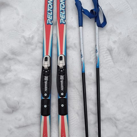 Sukset 110cm ja sauvat 90cm. Kiinnitys kenkiin remmeillä, remmit ehjät. Kaksi lasta on harjoitellut hiihtoa näillä.