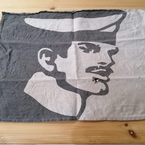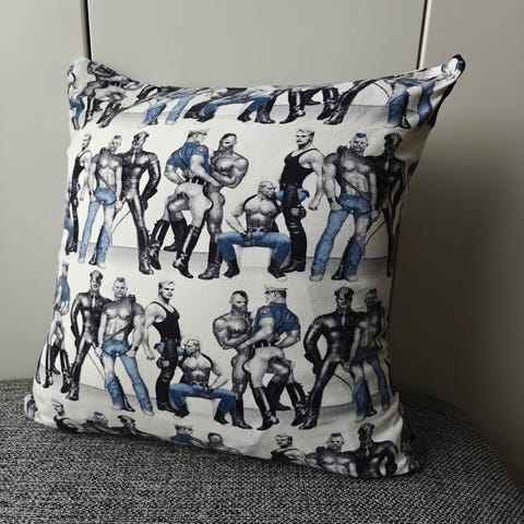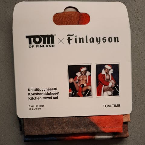 Jouluaiheinen Tom of Finland -kuosi (yksipuoleinen kuvitus). Ohuempaa kangasta, soveltuu esim. astiankuivauspyyhkeeksi. Pyyhkeessä "ruksi", eli voi laittaa roikkumaan esim. kaapinoven sisäpuolelle. Materiaali puuvillaa, pellavaa ja polyesteria.