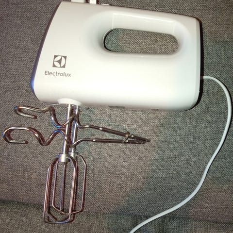 Sähkövatkain. Yksi vispilä puuttuu ja vatkaimessa pieni kolhu. Näkyy kuvassa. Toimiva.
