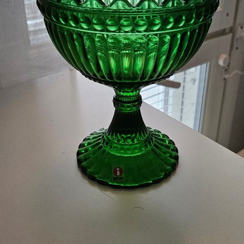 Marimekko lasinen malja vihreä. Malja on valmistettu lasista ja siinä on koristeellinen kuviointi. Sopii esimerkiksi tarjoiluun tai sisustuselementiksi.