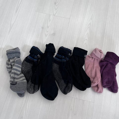 Kolme paria villasekoitesukkia. Kokomerkintä 34-36, mutta pesuissa kutistuneet. Eivät mahdu 35 jalkaan, joten sopinevat noin 31-33 koossa. Lilat muistaakseni Name it, mustista ei tietoa. Ehjät, nyppyä pinnassa.