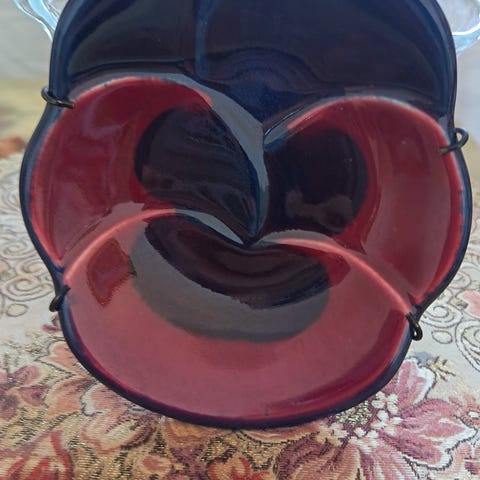 Myydään Arabia Florence -sarjan koristeellinen seinälautanen. Lautasessa on syvän sininen pohjaväri sekä näyttävä, helmiäishohtoinen kukka-aihe, jota täydentävät kohokuvioidut yksityiskohdat, kullanväriset helmikoristeet sekä kaksi pientä kellotaulua. Kokonaisuus on tunnistettavasti Florence-sarjalle ominainen: koristeellinen, taiteellinen ja elegantti.