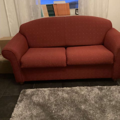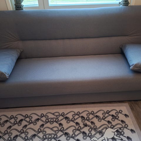 Puurunkoinen kangaspäällysteiset vuodesohva ja kalustetuoli. Sohvan kankaassa hieman kuluneisuutta, muutoin täysin ehjä. Noudettavissa Vantaan Martinlaaksosta.