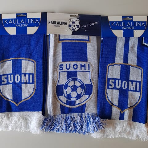 Finland huivi, jossa sinivalkoinen väritys ja Suomen vaakuna.