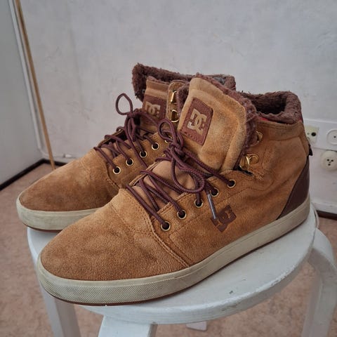 DC talvitennarit, koko 42. Korkeavartinen malli, musta päällinen ja punainen sisävuori. Nauhakiinnitys ja paksu kumipohja, jossa kuvioitu pinta paremman pidon tueksi. Sopivat vapaa-ajan käyttöön ja skeittaukseen. Pari kertaa jalassa olleet.