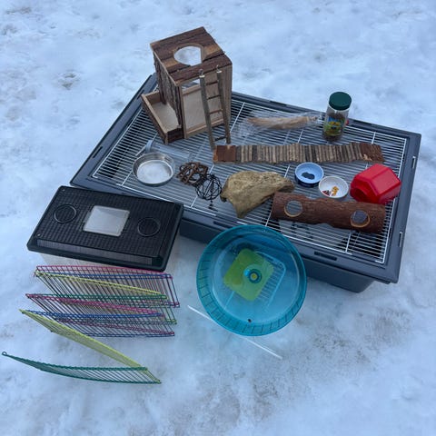 Meillä myynnissä 2 samanlaista häkkiä, hieman eri näköisellä sisällöllä. Toinen oli kotona ja toinen mökillä, näin hamsterin häkkiä ei tarvinnut kuljettaa ja hansterilla oli molemmissa paikoissa samanlainen häkki niin ei joutunut stressaamaan erilaista häkkiä. Settiin kuuluu: maja, ruokakuppi, pehmo (jota on kiva tuuppia 😍, selkäyställiben lautasmallin juoksupyörä ( pystyssä olevat juoksupyörät varsinkin pienet, rasittavat hamsterin selkää), puuputki, puusilta, kylpyastia. Sekä juomapullo.